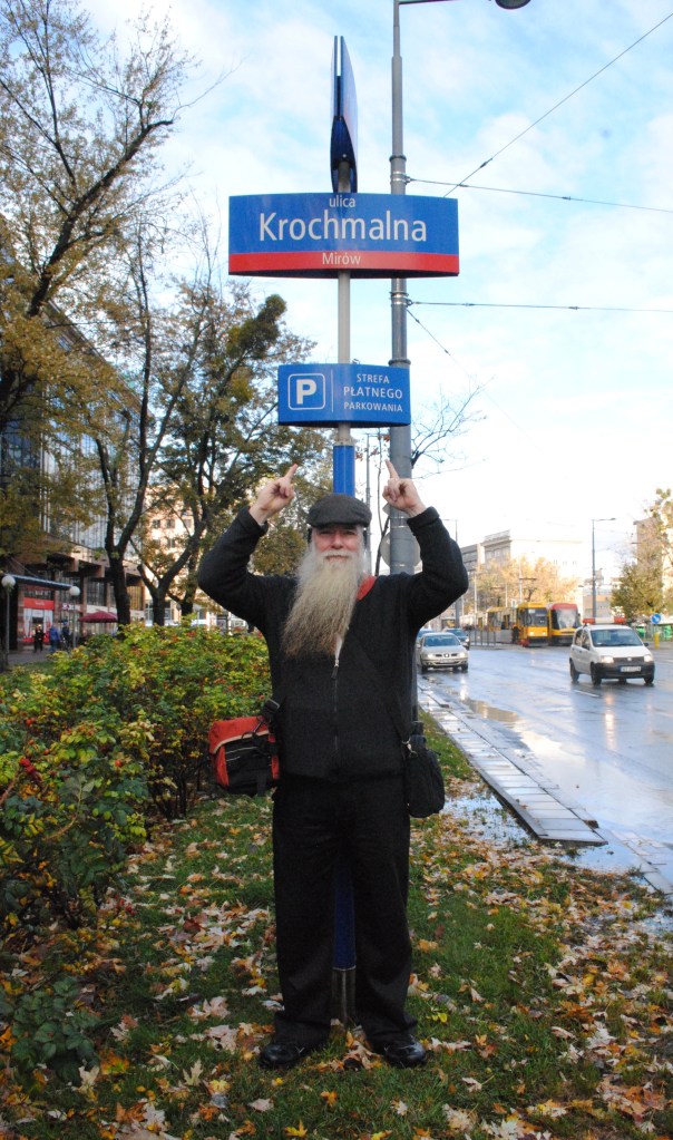 Wednesday, October 24, 2018 (continued): This is the third installment describing our visit to the Okopowa Jewish Cemetery in Warsaw. In this installment, we visit the mausoleum of three Yiddish writers: S. Ansky (or An-ski), Yacov Dinezon, and Yitskhok Leybush Peretz. On our way to the cemetery, Beth and I pass Krochmalna Street. Talk about serendipity! I ask her to take my picture beneath the street sign. It’s been raining off and on, and we get splashed with rainwater by a passing car. I don’t mind, but Beth isn’t happy because some of the water got on her camera.