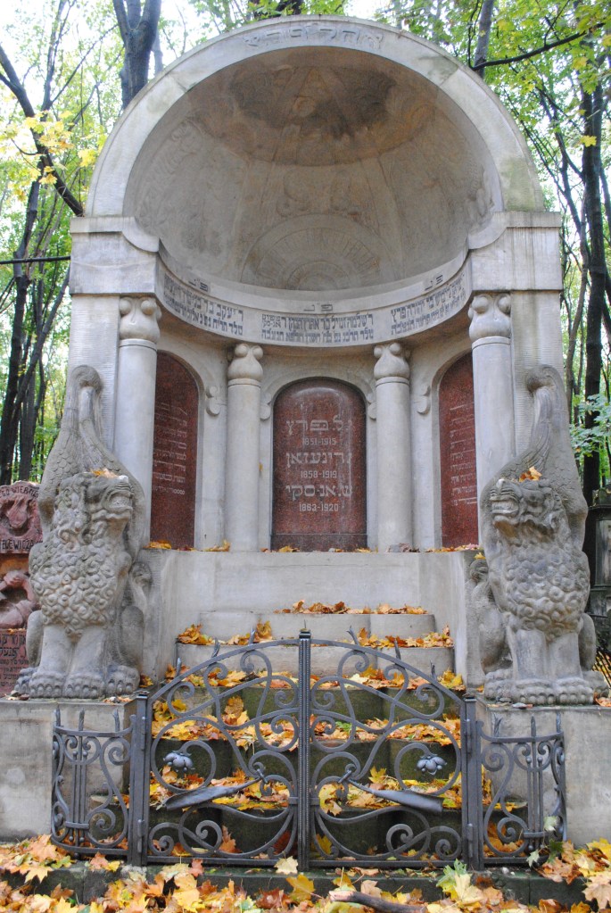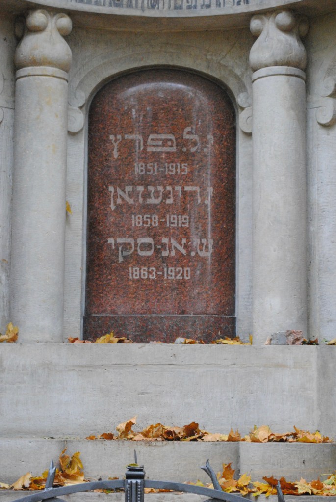 The three writers died in Warsaw, fairly close together in time: Peretz in 1915, Dinezon in 1919, and Ansky in 1920. All three are buried in the mausoleum.