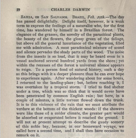 This past weekend, I visited, for the first time, a tropical rainforest, one near San Salvador, Brazil. I had the absolute best of guides, a young Englishman, only twenty-three years old. His enthusiasm about nature was infectious. I was in the company of Mr. Charles Darwin; I was reading the second edition (1845) of his book, The Voyage of the Beagle.
