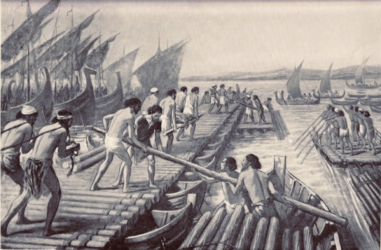 The plan was to build a pontoon bridge across the strait at its narrowest point. Because of the size of Xerxes’ army and the need to keep it supplied as it traveled, the decision was to build two bridges to be crossed simultaneously. One for use by the military, the second for use by the supply train. Once across, the two divisions would march side by side, ensuring the army stayed well-supplied on its journey to Greece. Modern armies have found themselves in situations where the army’s advance outstripped its supply source. Often, this has led to the invading army’s pillaging the countryside, taking food, and other necessities from the indigenous population.