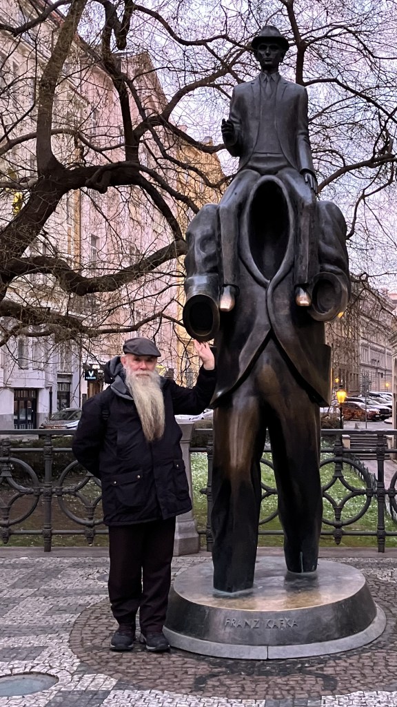 We visited two very different outdoor sculptures of Franz Kafka in Prague, the city where he was born and lived. The first one is by artist Jaroslav Róna. It is located in Prague’s Jewish Quarter (Josefov), at Dušní Street, near the Spanish Synagogue. It depicts Franz Kafka riding on the shoulders of a headless figure. The sculpture was inspired by Kafka’s 1912 story “Description of a Struggle” (Beschreibung eines Kampfes).